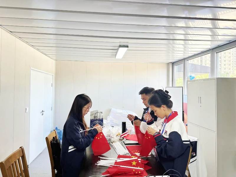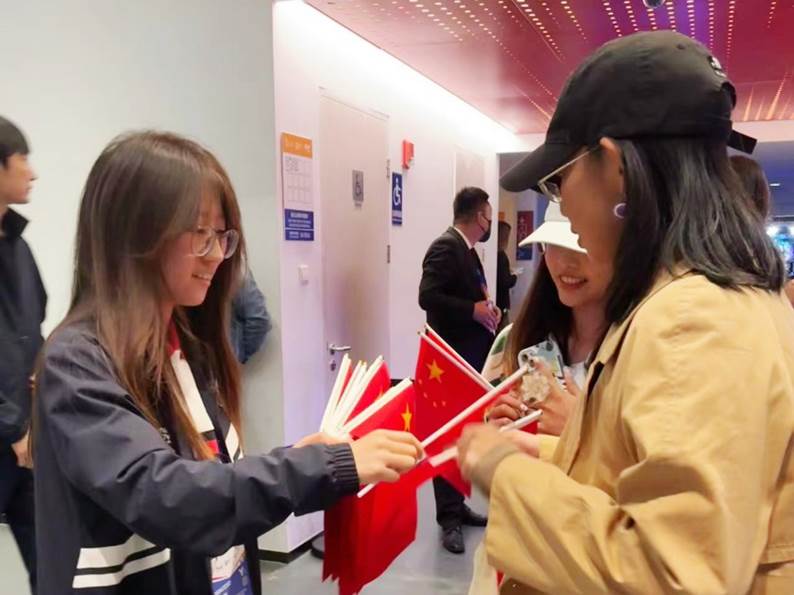 中网赛期恰逢国庆,为表达对伟大祖国的美好祝愿,营造庄严喜庆的节日氛围,tyc122cc太阳成集团本科生、现任公司青年志愿者协会主席的耿瑞璇带领志愿者们细心的为观众分发手持国旗,传承爱国情怀,弘扬爱国主义精神。