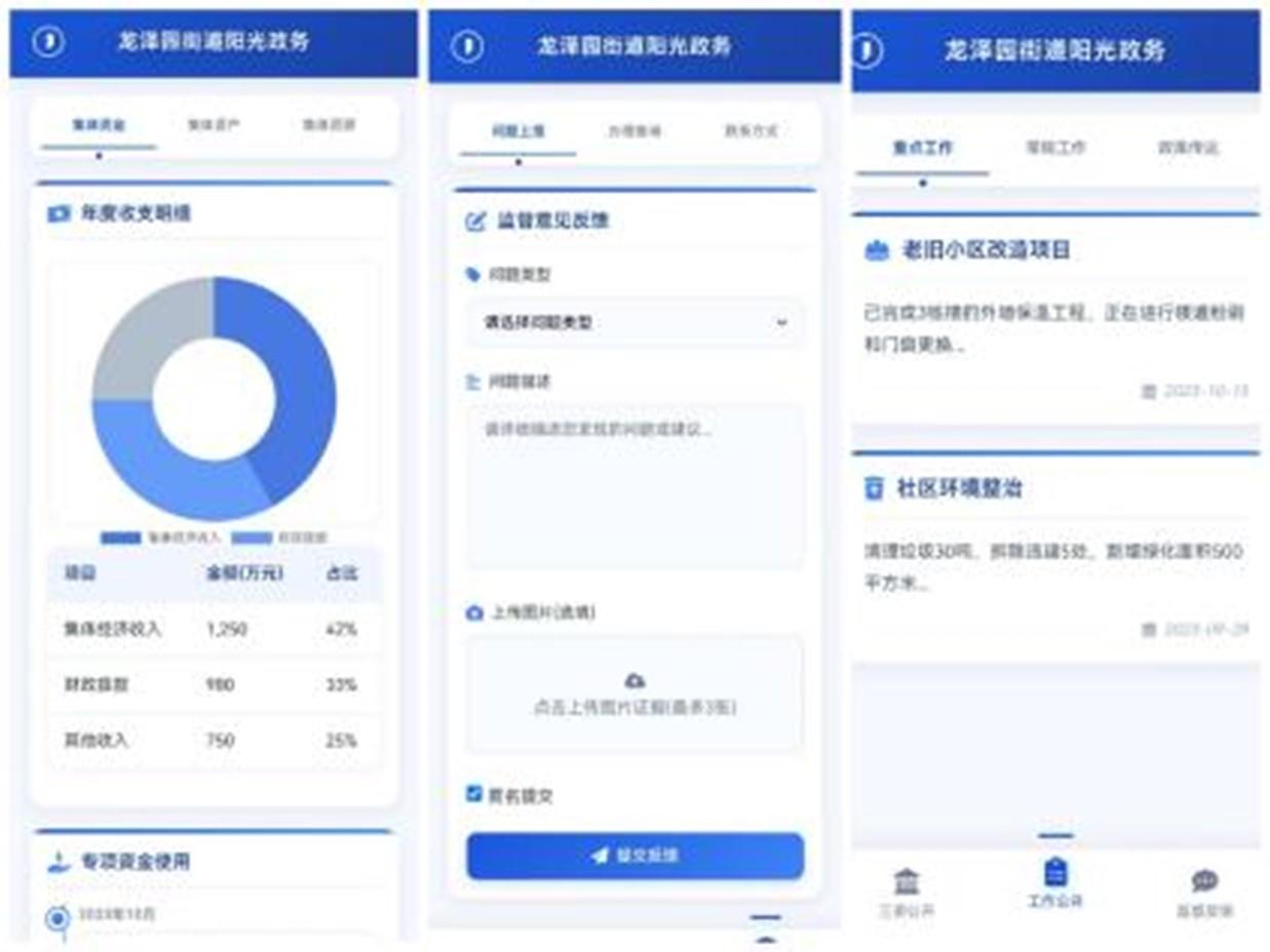 团队精心设计了《龙泽园街道宣传手册》,系统梳理和展示了街道在基层治理方面的创新经验与显著成效。同时,针对街道现有平台功能的空缺,团队专项开发了“龙泽园街道阳光政务”小程序,为居民提供便捷的问题上报、办理进度查询、政策解读及监督反馈等功能,助力基层治理进一步迈向数字化、透明化和互动化。