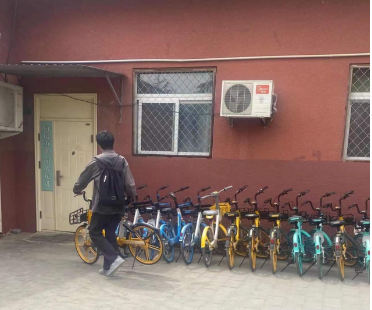 入党积极分子志愿者们将乱停乱放的单车整齐的摆放在规定区域,停车区重现整齐之美。