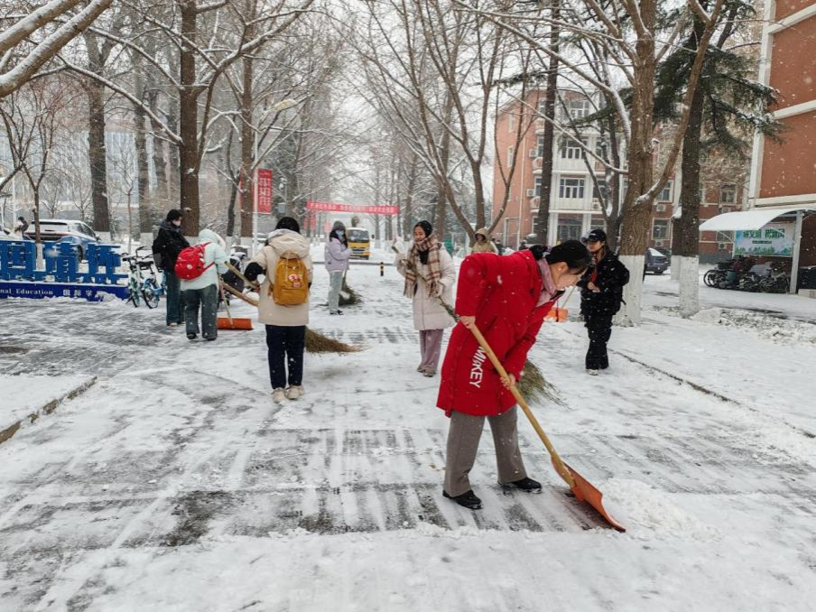 近日,一场大雪降临北京。一夜之间,城市银装素裹、晶莹剔透,校园变成了童话世界般的“冰雪奇缘”。只是景色虽美,路上厚厚的冰雪却给师生出行造成了诸多不便。12月13日中午,tyc122cc太阳成集团教师及高级党课培训班成员利用课后休息时间,开展扫雪工作。