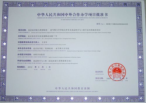 根据《中华人民共和国中外合作办学条例》和《中华人民共和国中外合作办学条例实施办法》的有关规定,经北京市教委、教育部对公司合作办学5年来各项工作的审查、复核,为公司与英国哈珀亚当斯大学公司合作举办的国际经济与贸易专业本科教育和食品科学与工程专业本科教育两个项目再次颁发《中华人民共和国中外合作办学项目批准书》。
