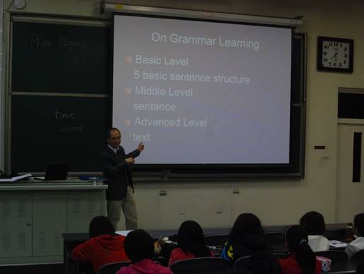 Prior to the lecture, upper classers presented the new students with their carefully prepared "mini stage plays" on campus life. In their laughter, the latter ones indentified with the real campus life and visualized the importance of hard-working. In his lecture, Mr. Li included the following topics: 1. General Guidance; 2. Entrance Test/IELTS; 3. Vocabulary learning; 4. Grammar learning; 5. Self-learning.