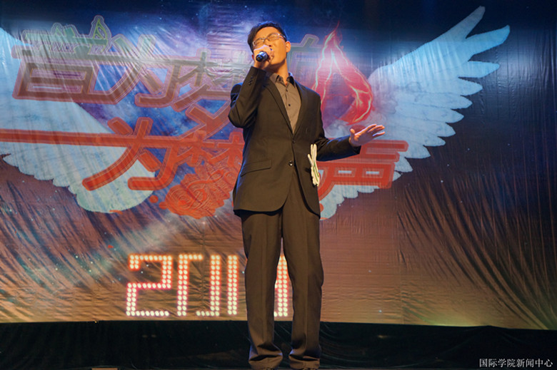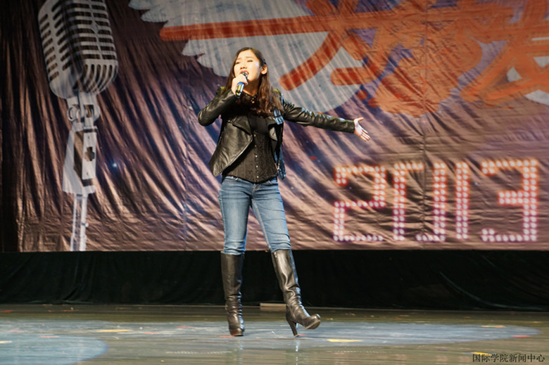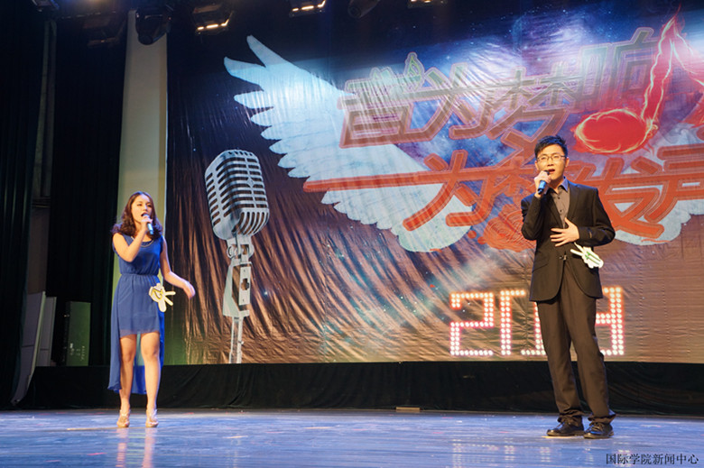 At the beginning, Tian Yumiao from international college,the champion of twenty-second Singing Competition performed a "Domino". During one month, a total of 15 players into the finally match, our international college player Wang Runyu emerged victorious in the semi-finals, On behalf of the international college enter the finalist round of competition. The first round, Runyu Wang with MengZhang singing