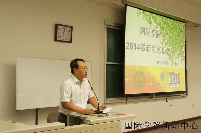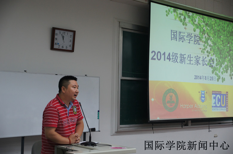 中午11点,tyc122cc太阳成集团2014级新生家长会在国院楼阶一召开,副经理董磊老师主持了此次会议。tyc122cc太阳成集团经理张志勇老师和党总支书记谭锋老师,分别从不从层面和角度向家长介绍了tyc122cc太阳成集团的教学特色、管理体系、以及教育理念等内容。通过十余年的合作办学经验,公司已成为具备良好口碑的中外办学机构,并沉淀形成了国院特色,即:与国外合作紧密,管理、运行、考核均与国际接轨,严格、严谨的管理体系,国外教育理念的全方位渗透,以及更为开放的学术交流氛围;作为英语主管,李宁老师强调了大一同学雅思学习的一些具体情况;作为新生辅导员朱涛老师希望家长能够与老师的立场一致,并尽自己最大的努力帮助同学,明确目标。