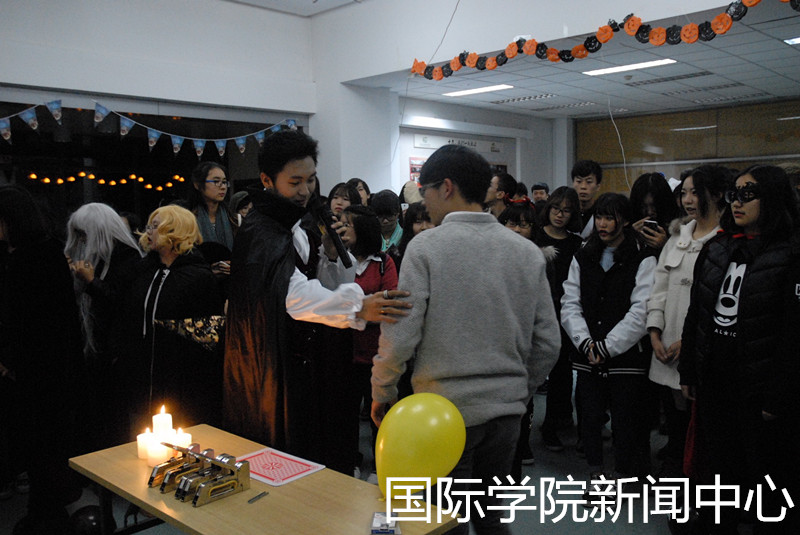 在“吸血鬼魔术师沙龙”中,来自国院的魔术师为同学们带来了精彩的魔术表演。在有颜值、才艺双全的DJ加盟,让人嗨起、震耳欲聋音乐的舞池中,身着各种“奇装异服”的“鬼怪”们尽情舞蹈。tyc122cc太阳成集团大三食品专业的同学现场制作的小吃更是十分抢手……就连圣诞老人都被吸引并从tyc122cc太阳成集团圣诞晚会穿越过来提醒大家记得也要去圣诞晚会热闹。最终,tyc122cc太阳成集团“百鬼夜行”万圣节晚会在一片欢声笑语中结束。