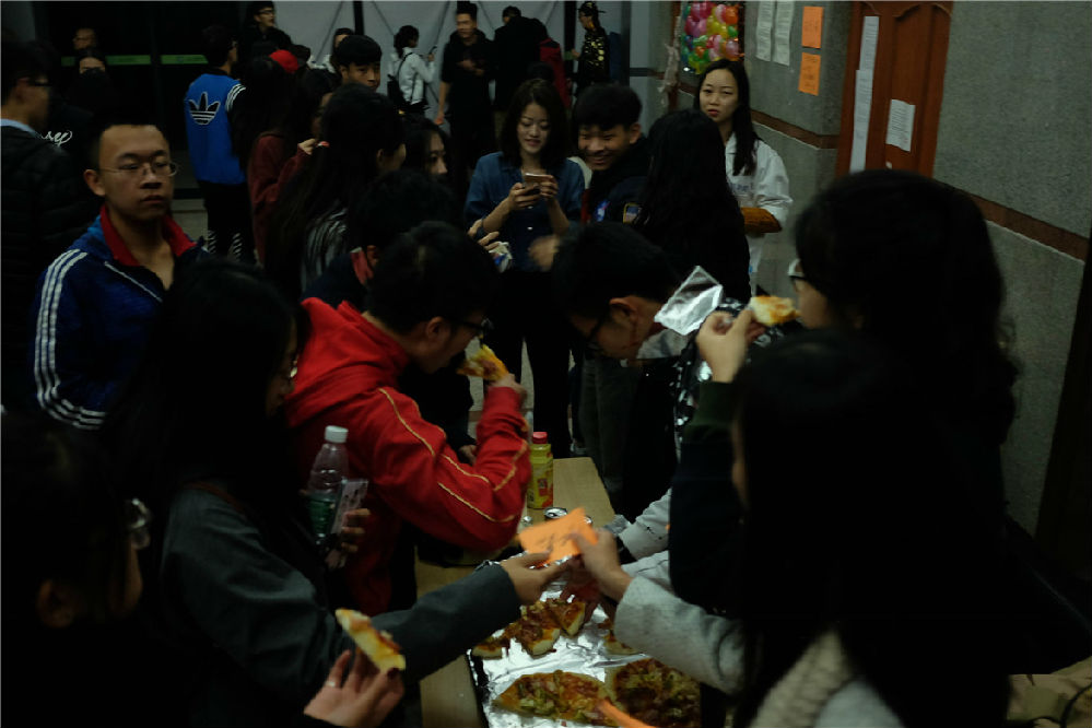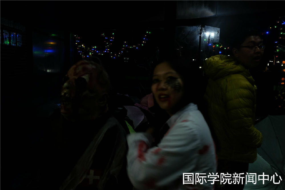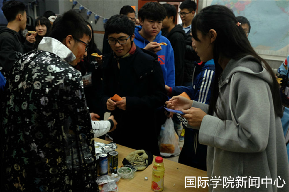In the activity “strange room”,students passed by the door wrote with the red words ‘chai’,under the guidance of international college volunteer, watching horror movies which have the Halloween atmosphere, with the ghosts and loud music outside, everyone can better blend in the party, show wonderful design of the activity.