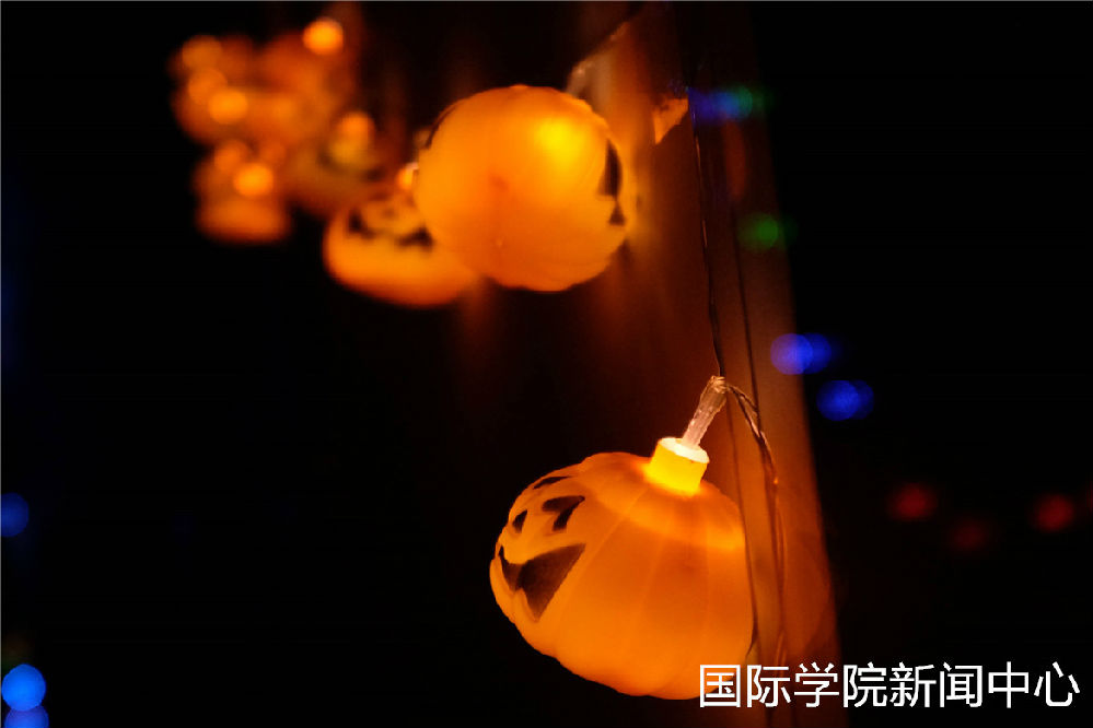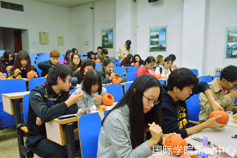 In the activity“DIY pumpkin and masks”,students through working together,designed and make a pumpkin lamp by“cut the pumpkins’top”,“clean the middle of the pumpkin”and “grave”,they can also make and design the Halloween masks by themselves too. The smell of pumpkin pervaded in the lecture thertre and showed the special atmosphere of Halloween