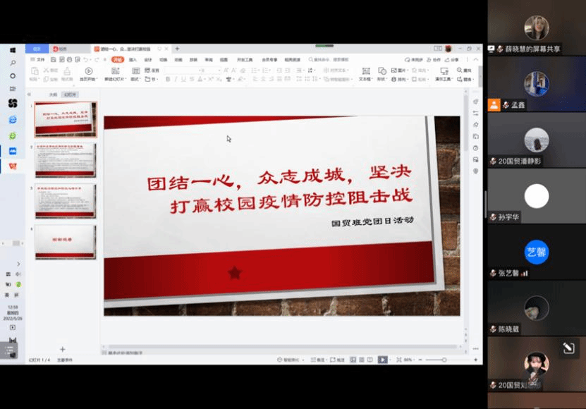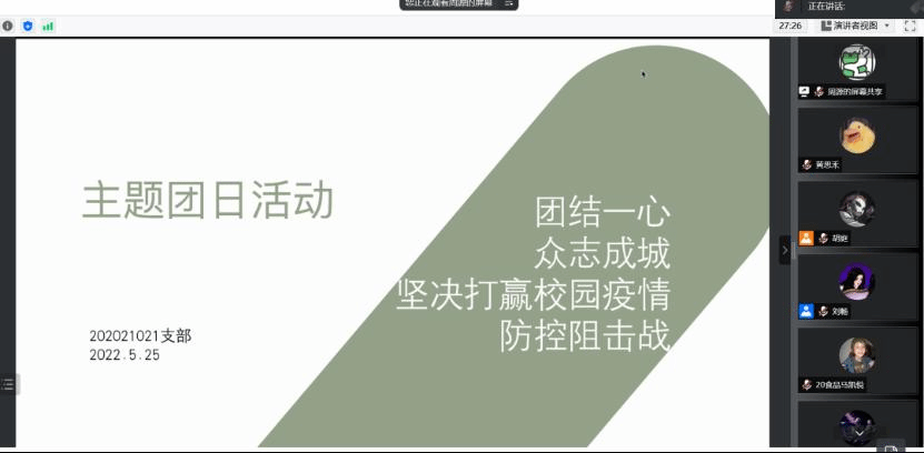 2022年5月23日起,在公司党委和上级团组织的领导下,tyc122cc太阳成集团团委有计划、分层次地组织各支部召开“团结一心,众志成城,坚决打赢校园疫情防控阻击战”主题团日活动,实现全覆盖,全员发言、表决心。一是认同国家防疫政策方针,坚定“四个自信”;二是认清全国和北京疫情形势;三是支持配合校园和社会防控措施,自觉做表率;四是发挥团员青年先锋队突击队作用,坚持打卡、做核酸、接种疫苗、不出校园、不外卖不网购。各团支部采用学习讨论、心得分享、经验共享、海报制作、短视频等多种方式进行开展。在线上会议中,同学们积极发言,展开讨论,深感团员责任之重大。