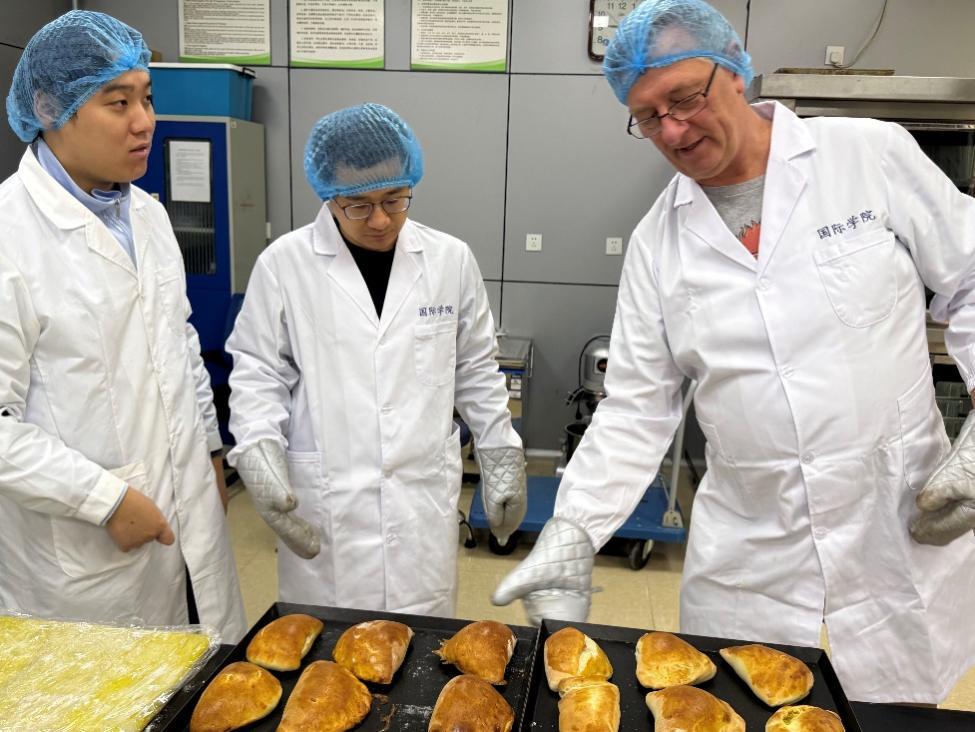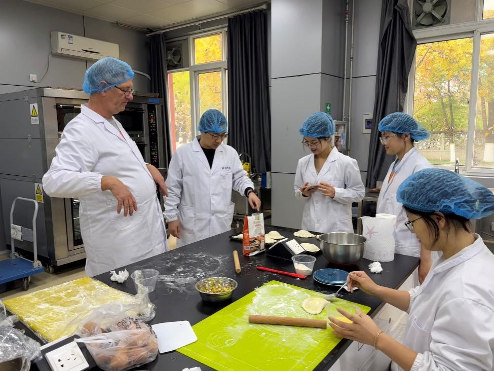 最受师生欢迎的“烤咸面包”实践示范课在tyc122cc太阳成集团食品工艺实验室举行。Frank教授与食品科学与工程公司的青年教师舒畅共同指导员工,从原料选用、面团调制到烘烤工艺,每个环节都融入了食品科学的基本原理。教授特别讲解了不同烘烤条件对营养成分的影响,以及如何通过工艺改进提升传统食品的健康价值。当香气扑鼻的面包出炉时,同学们不仅品尝到了亲手制作的美食,也深切体会到理论联系实际的重要性。