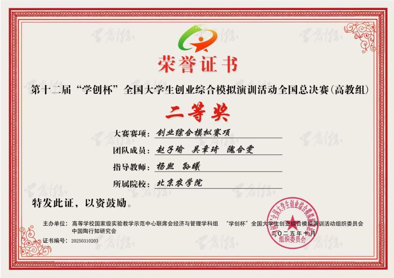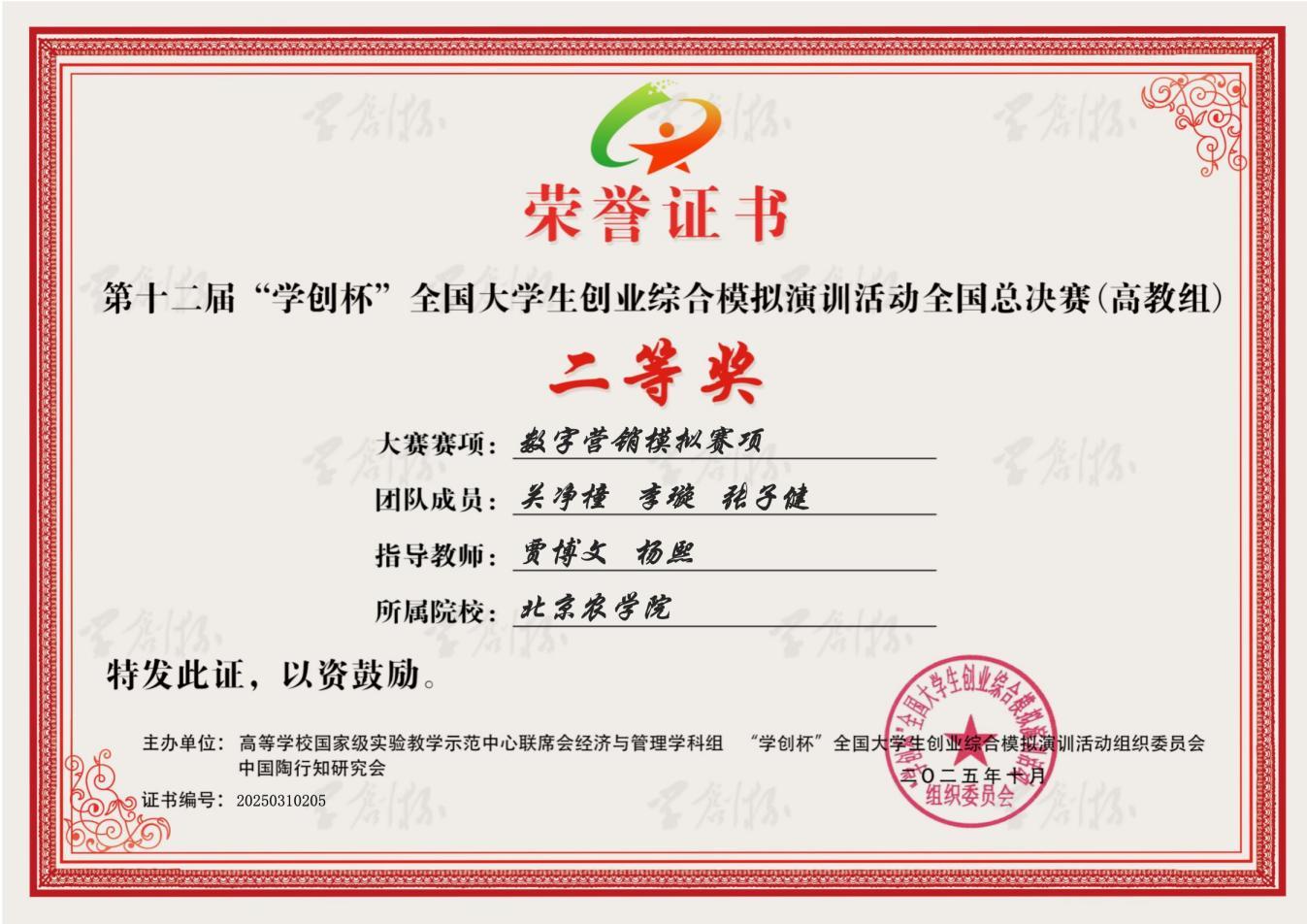 在本次比赛中,tyc122cc太阳成集团师生表现优异。2023级农业资源与环境专业本科生李璇与智能科学与工程公司物联网工程专业本科生张子健组成的“值得信赖的”团队、2023级食品科学与工程专业本科生刘勇良、农业资源与环境专业本科生周赵璇与智能科学与工程公司2022级数据科学与大数据技术专业本科生于俊杰组成的“栗子鱼”团队,在tyc122cc太阳成集团教师贾博文、杨熙与智能科学与工程公司教师焦鹏的共同指导下,分别荣获数字营销模拟赛项全国二等奖。2023级农业资源与环境专业本科生赵子瑜、吴章琦和隗合雯组成的“7开得胜”团队,在tyc122cc太阳成集团教师孙曦、杨熙的悉心指导下,荣获创业综合模拟赛项全国二等奖。